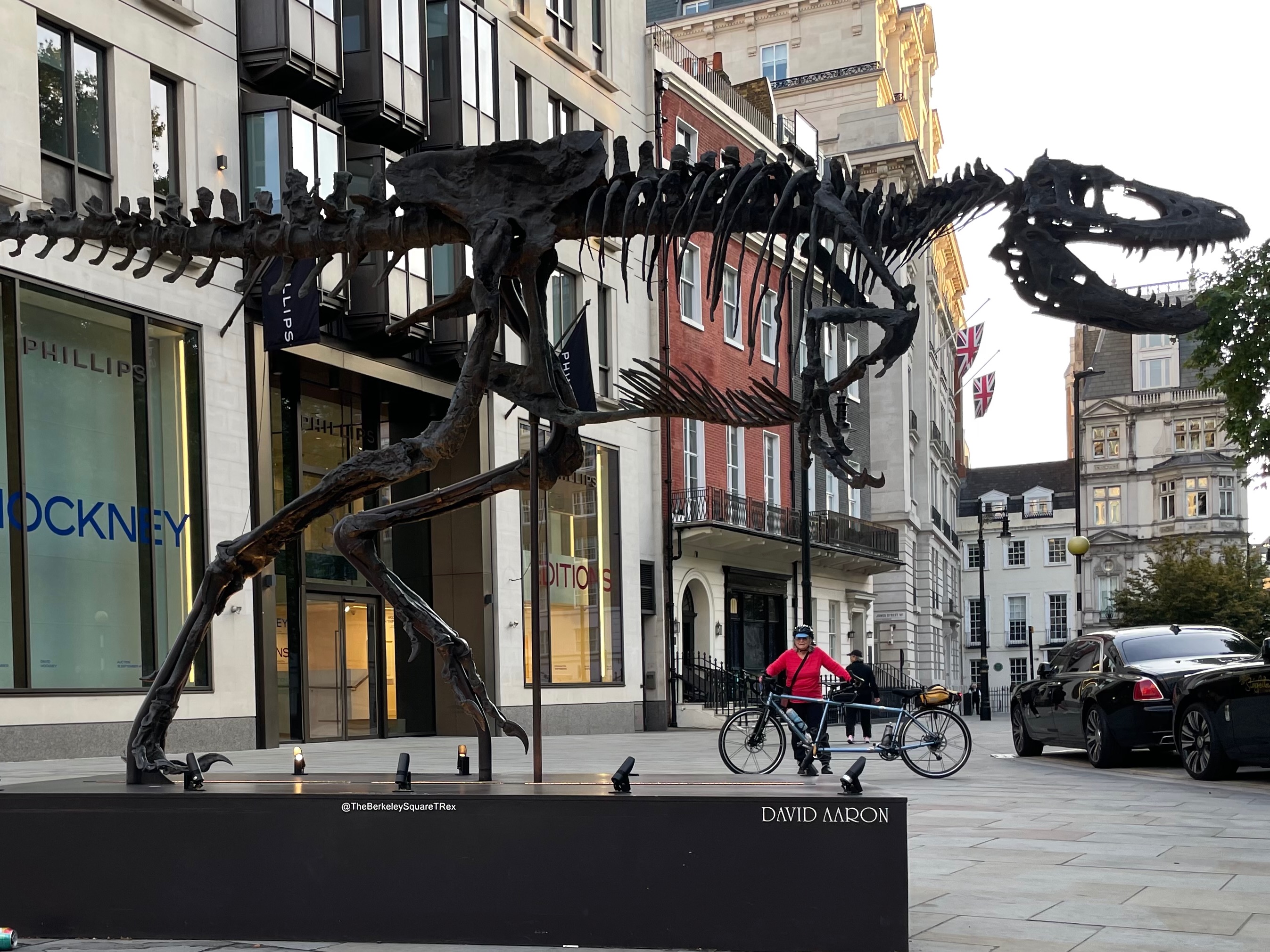 We then rode around Berkeley Square’s pleasant loop and peeled off on Davies Street, where we spotted a full-sized Tyranasaurus Rex headed to the park sans flesh.