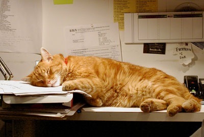 Some days, he’d simply reach out and pull over the waste basket- big noise.  When nothing else worked, he’d topple the piles of Sharon’s books. I think this the most cunning.