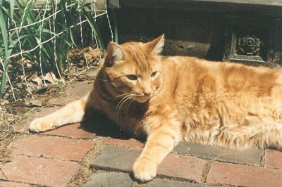 One warm summer day in YB’s latter years, he was sleeping contentedly, when the competition paid a visit. This cat boldly jumped down into our backyard.