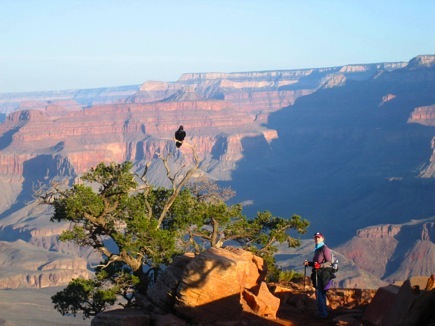 By 6:30 AM Sharon and I were on the trail. We chose the S. Kaibab trail for our descent as it is one of the few trails which follows open ridge lines and therefore offers spectacular panoramic views of the main gorge. It is also steep with no shade or water and has 400’ more in elevation change than Bright Angel Trail, our selected return route. Since it would be down one and up the other, a descent of S. Kaibab in the cool of morning seemed preferable to an ascent in the heat of the afternoon. Think we made the right choice.