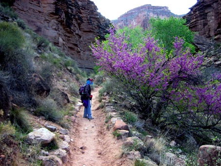 By the time we hit that stretch, thankfully, parts of the corkscrew were already in the shade. Up we plodded. We climbed out of the inner gorge and followed Garden Creek up to Indian Garden. Arriving around 3:30PM, Redbuds were blooming along the creek. We were making pretty good time considering. Only 4.5 miles and 3000’ to go.