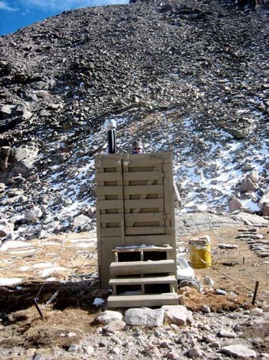The adjacent outhouse offers a 360° view as it is topless and privacy, as it is raised. In the slideshow, note the dozen or so steel stakes and guy wires needed to keep it upright.