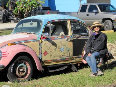 A charming hand painted VW bug sign with vultures snacking in a dumpster. Business as usual in Everglade’s City.