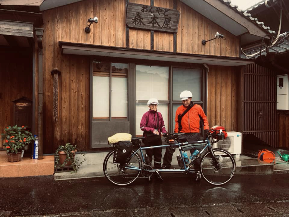 We headed out at 8 AM or so in full rain gear. It was pouring. Mima-san took pics. She was laughing. Crazy Americans ride off on a crazy bike into a Typhoon. Great stuff for a new Morimoto-ya Japanese facebook post. Which indeed was how it turned out.