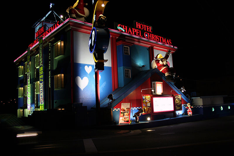 Love Hotels are hotels catering to folks interested privacy for doing the deed. A somewhat Japanese institution. Makes sense in world of paper thin walls. Purportedly compete with anonymous check-in, double-blind pizza delivery, and in-room sex toy vending machines. And themed rooms which well, run the gamut.