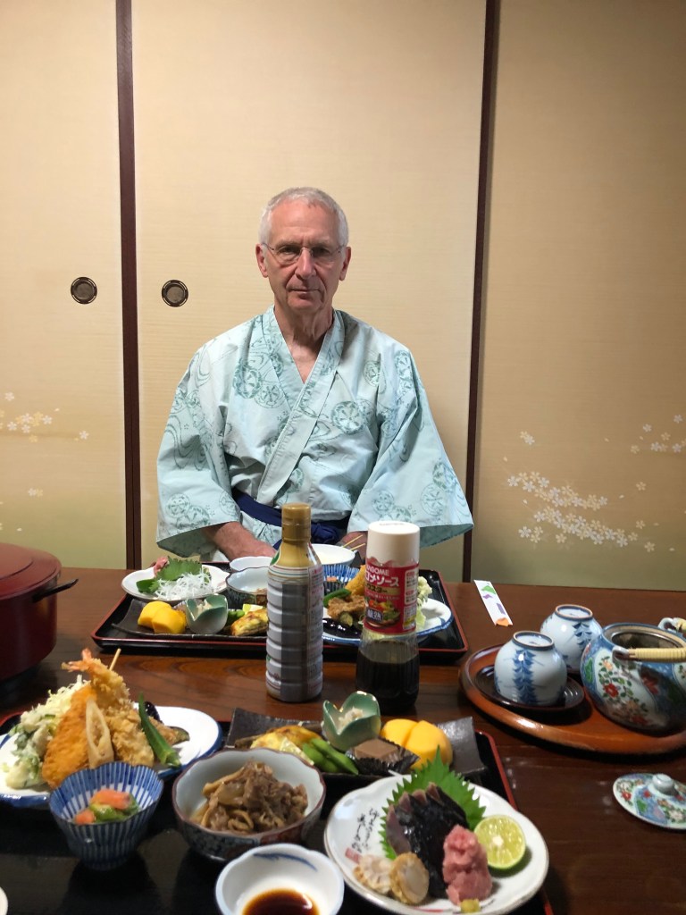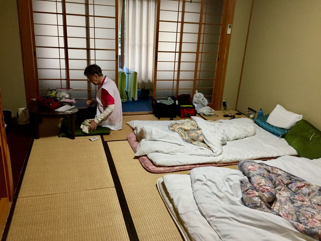 On our descent from the pass, we almost missed our inn, Misato no Yu up and off to the right. Misato no Yu was a relaxed hot springs inn with dining. Their Japanese/French cuisine was pretty fabulous. We had western beds and even a hair dryer to dry our shoes.