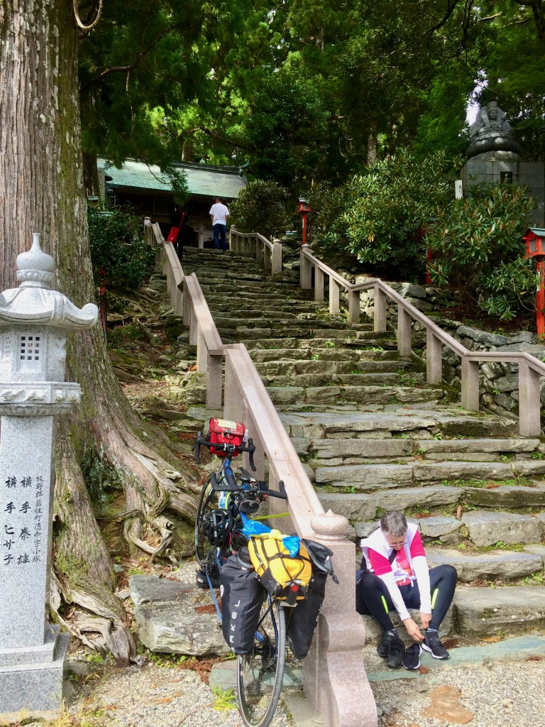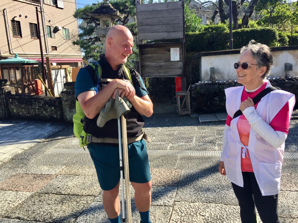 He didn’t speak a word of English, but he made it pretty clear, that he didn’t think much of our chances for making it to Kakurinji, Temple 20, on our bike. Like it’s way up here and the unspoken – you are old folks, and foreign old folks at that.