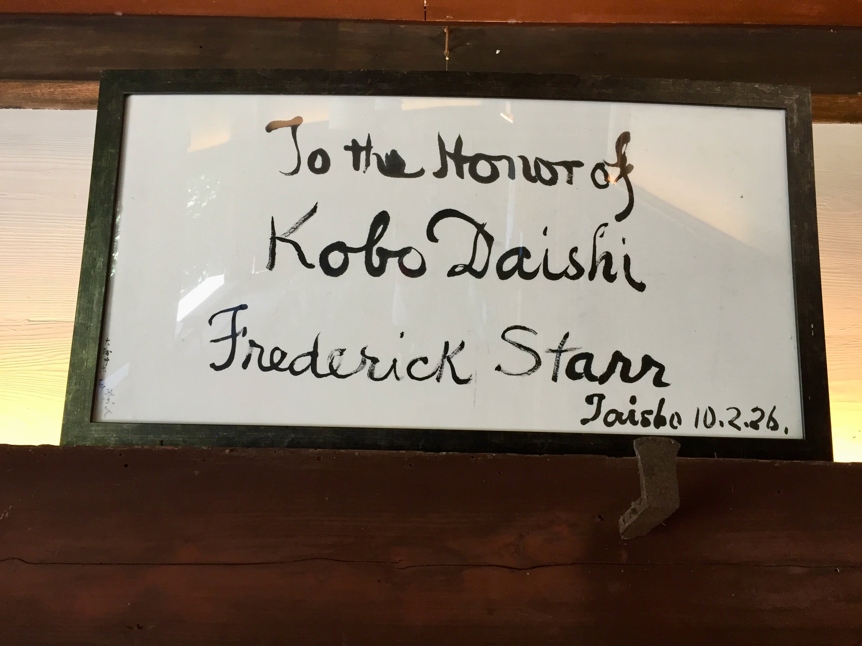 Frederick Starr, an American anthropologist, visited in 1926 and left a calligraphy of sorts. Proudly displayed. Starr is purportedly the first westerner to complete the pilgrimage. Just about a 100 years before us. He walked some. And used rickshaws and trains. In 1926 he would have been 72, Sharon’s age.